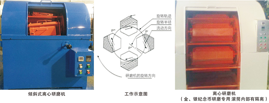 本產(chǎn)品采用了行星式加工原理,適用于大小批量小型零件的去除毛刺、表面氧化層及拋光的加工,在回轉(zhuǎn)圓盤上配 置四個(gè)滾筒(四個(gè)研磨槽)或六個(gè)滾筒,滾筒即隨圓盤高速旋轉(zhuǎn)和自轉(zhuǎn)的相對(duì)運(yùn)動(dòng),從而得到了滾筒中零件和磨料、水、 研磨液的相互擠壓的磨削運(yùn)動(dòng)。